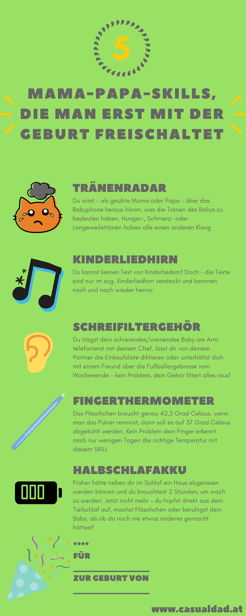 „Ahhh 5 Mama-Papa-Skills? Vor einem Monat gab es 5 Upgrades für Eltern – Casual Dad jetzt reicht es dann mal mit den Aufzählungslisten!“