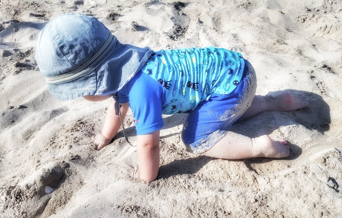 Auch wenn sich Little S noch nicht ganz sicher ist, ob er Sand an den Händen und im Gesicht mag – den einen oder anderen Mini-Pool hat er schon recht genossen. Der eine Mini-Pool war von einem Iren links von uns. Der war riesig und in den Spitzenzeiten waren bis zu 4 Kinder drinnen. Der andere war schon da, wie wir uns ausgebreitet haben und ich habe ihn dann verfeinert und tiefer gegraben…mit Trinkflaschen-Halterung und Quetschie-Kühlung!